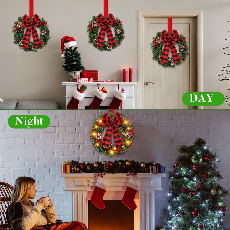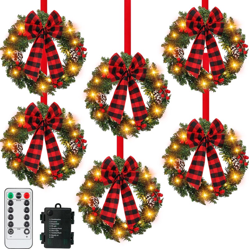 • Stunning Set of 6: elevate your holiday decor with our stunning set of 6 Lighted Christmas wreaths. Each wreath is adorned with 15 mesmerizing LED lights, creating a warm and inviting atmosphere that will transport you to a winter wonderland; Our Christmas wreath is ideal for doors, windows, porch, fireplace, wall, mantel, fridges, cars, and more, bringing magical glow and joyous ambiance, add festive to any space