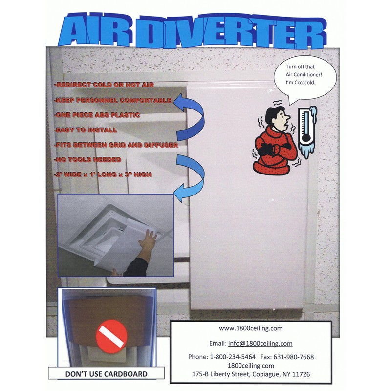 Package of 4 This 24"x12" air vent deflector is specially-designed to divert hot or cold blowing air from ceiling HVAC air conditioning registers away from the areas you want to protect. You can also direct the flow towards you for more air. It is easy to install and fits standard-sized 2'x2' HVAC diffusers, vents, and registers. This air vent diverter redirects airflow without inhibiting or restricting the flow of air from your ceiling HVAC diffusers. As such, they should never be used in pairs to block an entire diffuser. This air vent deflector is made of durable 0.090 gauge polystyrene so it is built to last. It is white in color so it will blend seamlessly with most ceilings and HVAC air diffusers. Its dimensions measure 23-3/4" wide x 11-3/4" long x 2-1/2" high. At 1800ceiling.com, we offer a full array of air vent deflectors suitable for a wide array of installations and applications. Shop our expansive inventory of air vent deflectors and air vent diverters below and save on all of your ceiling repair needs. NOTE: Air Diverters are intended to be used one at a time. Do not block the entire diffuser by using two side by side. NOTE: Building Engineers, this item redirects airflow and does not inhibit or restrict the flow from HVAC diffusers.