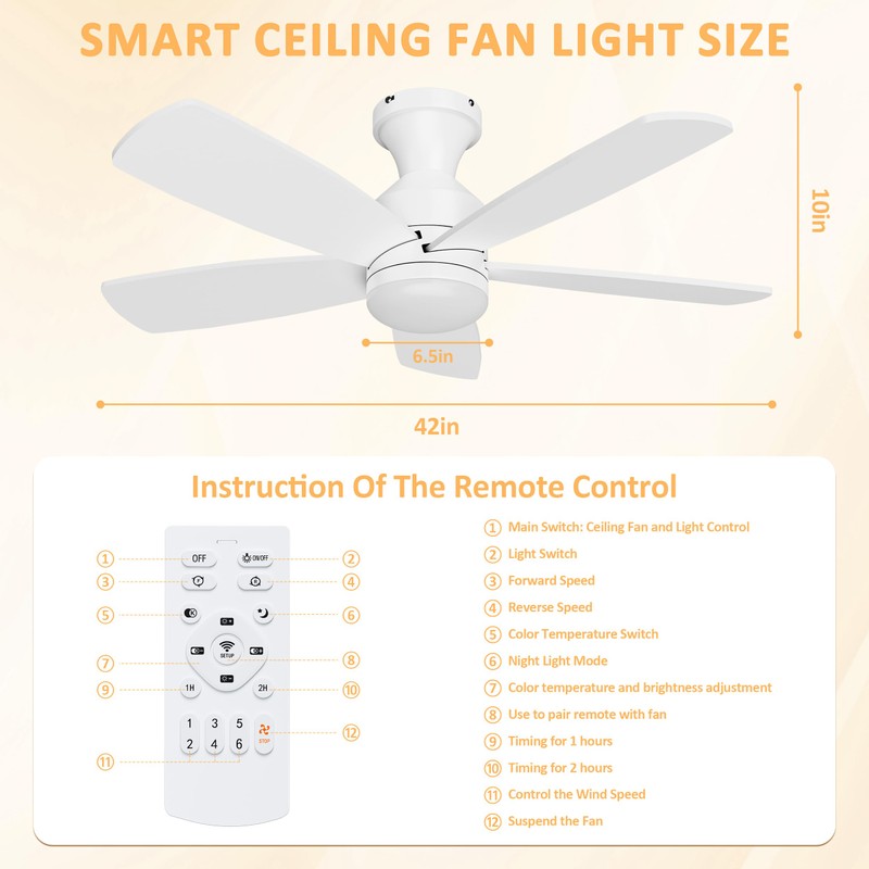 • Smart Control via Remote & App: Adjust fan speed (1-6 levels), dimmable LED brightness, color temperature, and set a 1H/2H timer with the included remote. Pair with the app (QR code in manual) for personalized smart settings.