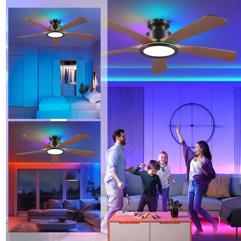 Ceiling Fans with Lights and Remote/APP Control, 52" Low Profile Flush Mount Ceiling Fan with RGB Ring Light & Dimmable, 5 Reversible Curved Blades 3 CCT 6 Speeds for Bedroom Living Room Party, Brown
