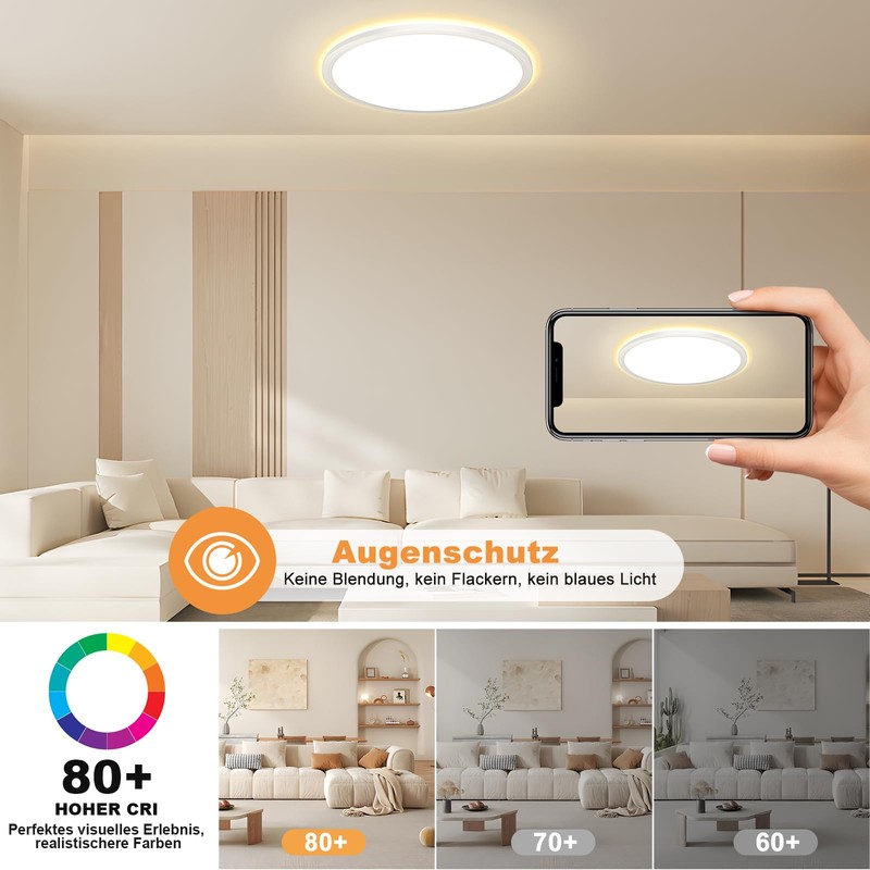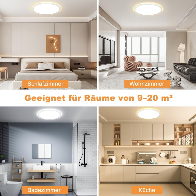 - Versatile use, suitable for wet rooms: you can attach the ceiling light in a room of about 9 to 20 m². Ideal LED ceiling lamp for living room, bedroom, bathroom, children's room, study, kitchen, bathroom, office, hallway, balcony, corridor, basement, front door, staircase, warehouse, hotel, etc. With protection class IP44, also as a LED wet room light. Ideal as a living room lamp, bedroom lamp, kitchen lamp, daylight lamp.
