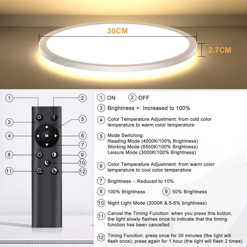 This LED ceiling light supports continuous adjustment. Long press the button of the remote control, you can freely adjust the colour temperature (3000K-6500K, warm white/neutral white/cool white) and the brightness (10%-100%). Easily find the most pleasant lighting atmosphere. Note: You can also change the colour temperature (3000K, 4000K and 6500K three modes) with the wall switch.