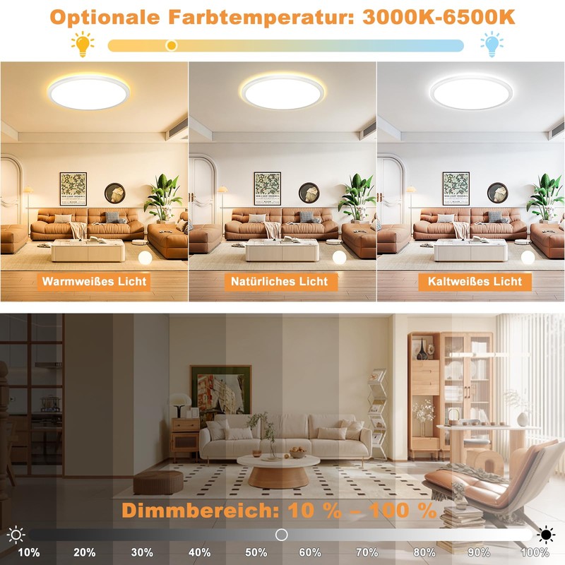 - Stepless dimming: this LED ceiling light supports continuous adjustment. Long press the button of the remote control, you can freely adjust the colour temperature (3000K-6500K, warm white/neutral white/cool white) and the brightness (10%-100%). Easily find the most pleasant lighting atmosphere. Note: You can also change the colour temperature (3000K, 4000K and 6500K three modes) with the wall switch.