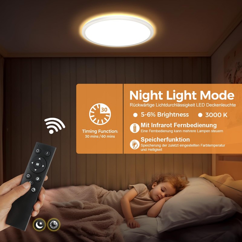 As a night light, the minimum dimming brightness of the dimmable ceiling lights for bedroom can reach 5% at 3000 K warm white. The quiet and warm light atmosphere of the night light mode makes children or the elderly fall asleep faster. The timer function allows the ceiling light to be switched off automatically after 30/60 minutes before bedtime. Remote control with 2.4G wireless remote control technology, which is more sensitive.