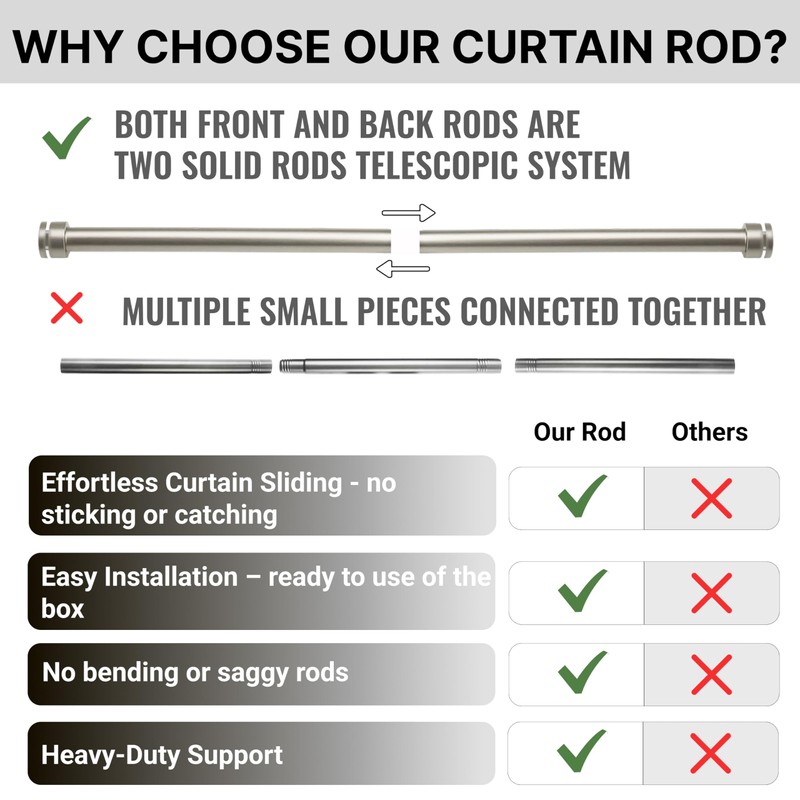 - Smooth Sliding Thanks to Solid Telescopic Rods - designed for effortless curtain movement, this ceiling mounted double curtain rod features a durable telescopic system with solid rods that glide smoothly—no snags, no hassle.