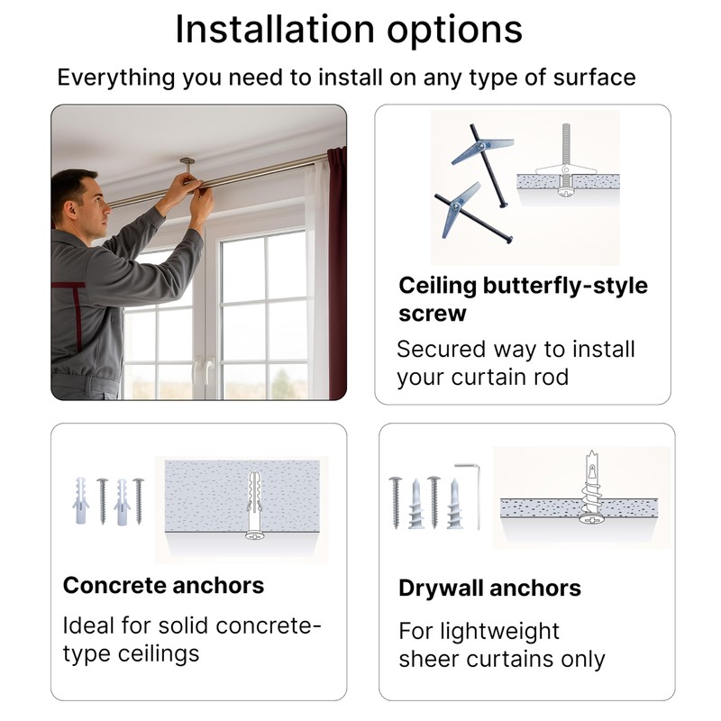 - Complete Installation Hardware Included - comes with three distinct mounting kits to suit various surfaces, making setup of your curtain rod double a breeze — no extra purchases needed.