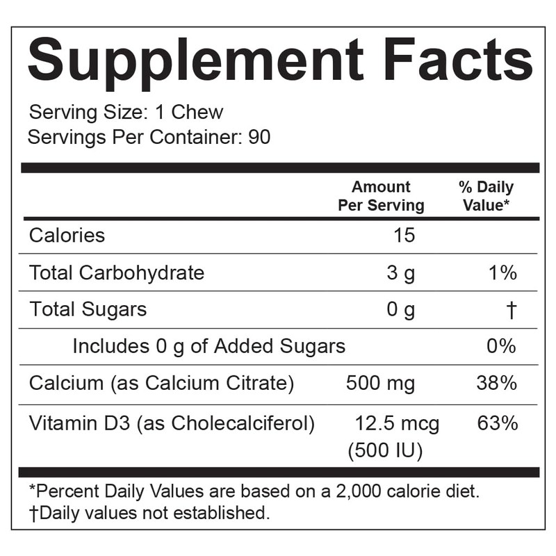 - Optimized Nutrient Absorption: Each soft chew contains 500mg of Calcium Citrate, the most bioavailable form of calcium, ensuring maximum absorption. Utilizes a water-miscible form of Vitamin D to enhance absorption without the need for fat intake