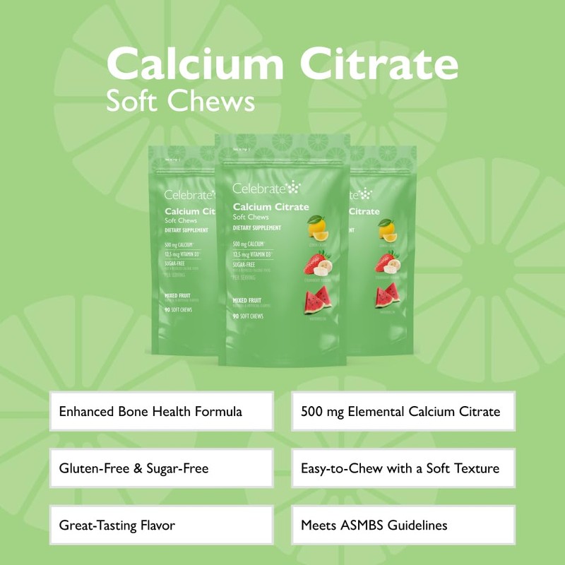 - Premium Calcium & Vitamin D Boost: Each bariatric calcium citrate soft chew provides 500mg of Calcium Citrate and 500 IU of Vitamin D3 to aid in calcium absorption and bone health - both essential nutrients for post bariatric surgery patients