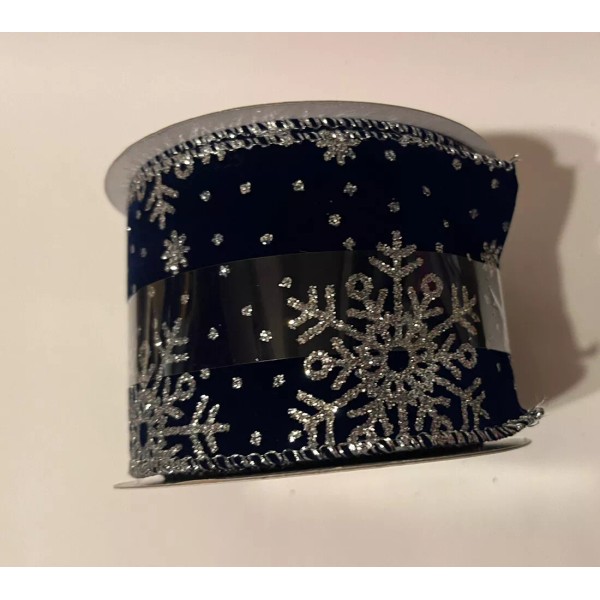 Celebrate It 2 1/2” x 20 Ft wired Silver Snowflakes On Navy Ribbon For Christmas Or Winter