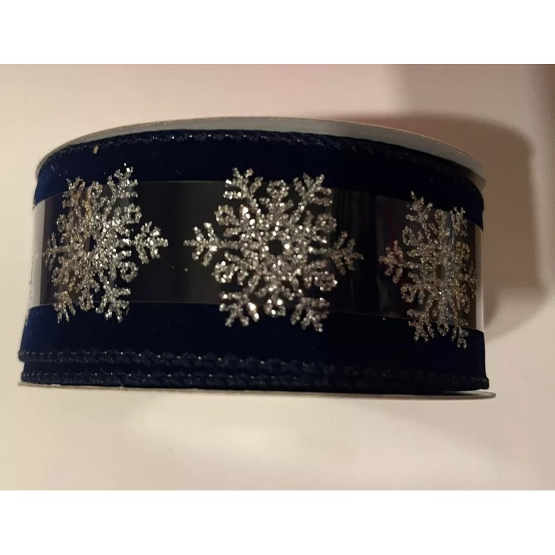 2.5” x 20 ft wired edge ribbon. Silver Snowflakes on Navy Blue.