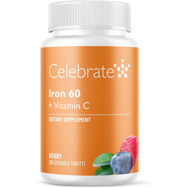 Celebrate Vitamins Iron Supplement with Vitamin C - 60mg Iron, 60mg Vitamin C, Bariatric Vitamins for WLS Patients, Vertical Sleeve & Gastric Bypass Surgery - Berry, 30 Chewable Tablets