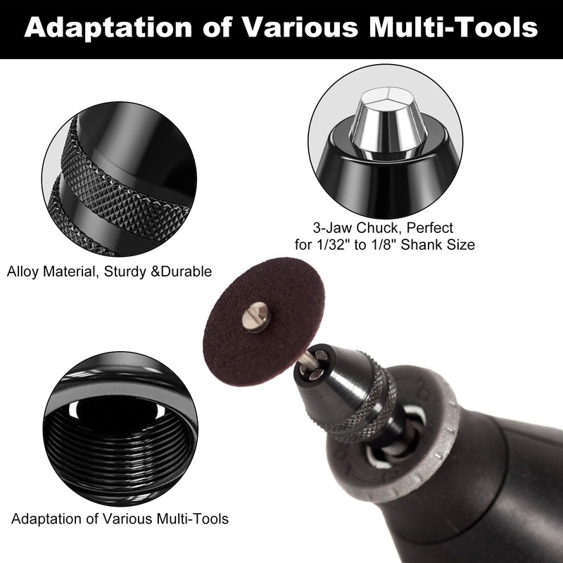 - Standard Drill Chuck: The drill chuck is made of high-quality aluminium alloy with a built-in spring for flexibility and stability; rotary tool accessories quick change chuck can accommodate a wide range of attachments from 1/32" to 1/8" shank sizes