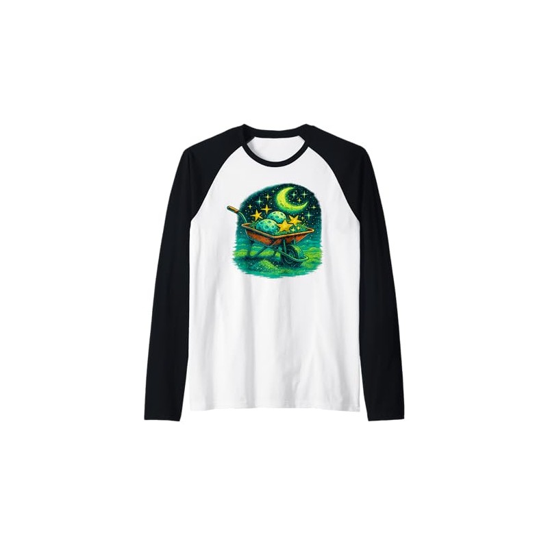 - A whimsical and surreal design of a wheelbarrow filled with glowing moons, stars, and planets under a dreamy night sky. Perfect for anyone who loves celestial landscapes, cosmic wonder gardens, magical starlit scenes, and otherworldly nature vibes.
