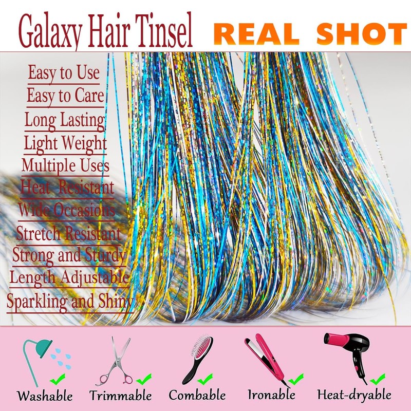 CelineBella Colorful Hair Tinsel Extensions Kit,Gold Silver Blue Ombre Effect,3-Tones Gradient Fairy Hair,Galaxy Pattern Tinsel Hair for Kids Girls(Boxed)