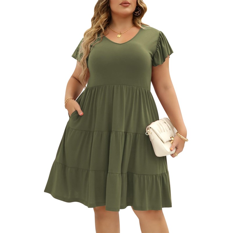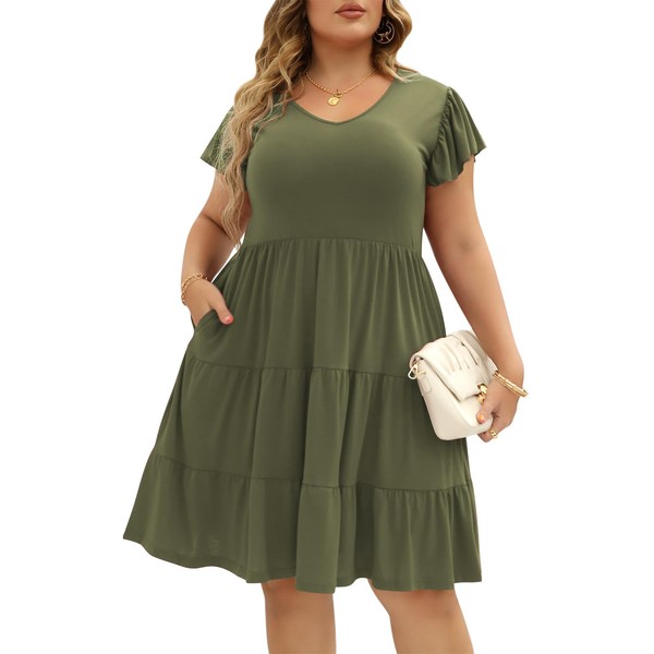 Celkuser Womens Plus Size Casual Summer Dresses Ruffle Sleeve Tiered Swing Midi Dress with Pockets(cel137,20,Olive)