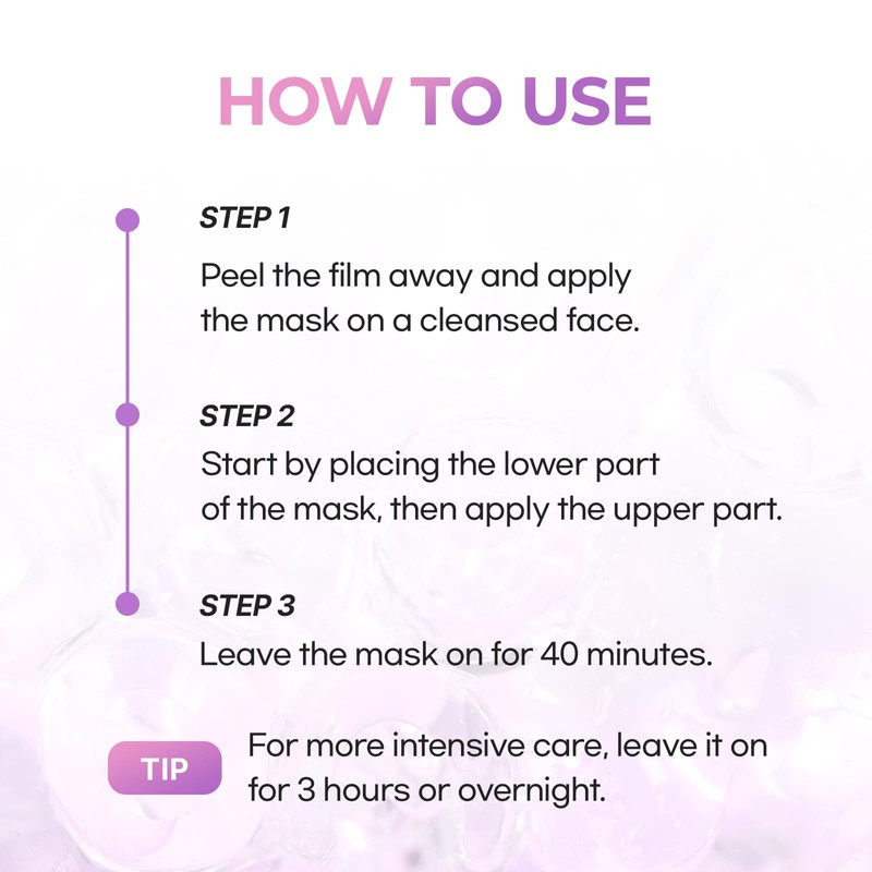 - [COLOR-CHANING HYDROGEL] The gel mask becomes transparent after 3 hours, indicating that the active ingredients have been deeply absorbed into the skin.