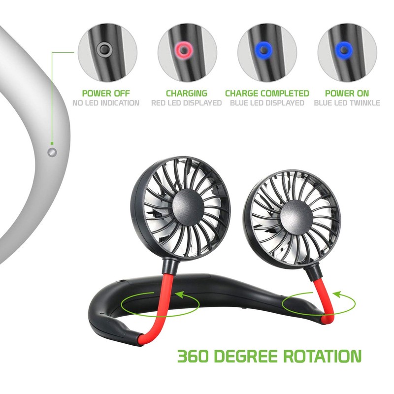 - Equipped with smart LED indicator lights. Red LED light is displayed when neck fan is charging, blue indicates fan is completely charged and blue blinking LED light indicates fan powered is on.