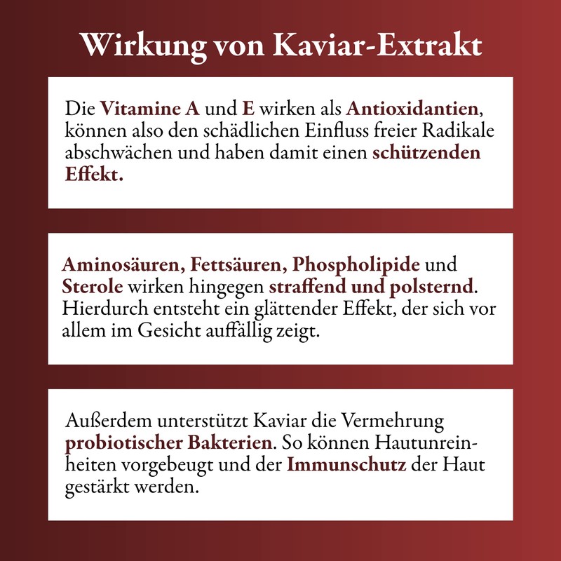 - ✅Probiotic Bacteria: The ingredients of the caviar can positively influence the natural skin flora by promoting the growth of probiotic bacteria. The protection of the skin is strengthened. Inflammation, damage and blemishes can be reduced.