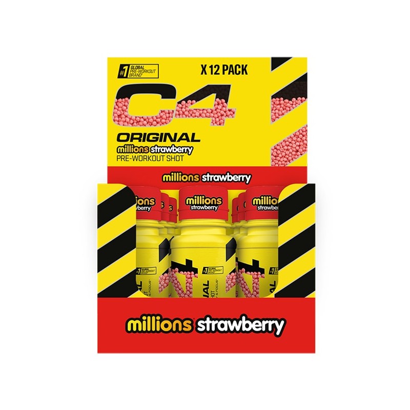 C4 Original Pre-Workout Shots Millions Strawberry. Strawberry candy flavour food supplement with vitamins, amino acids and caffeine, with sweeteners.12 x 60ml