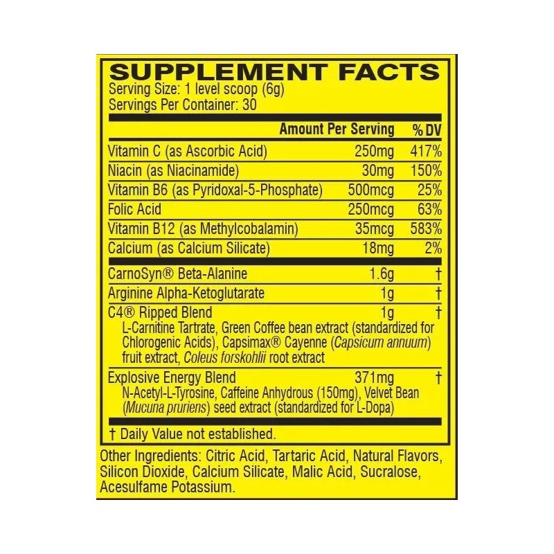 - Valores nutricionales por porción: 0 g azúcares,0 kcal valor energético,1 g arginina alfa-cetoglutarato,1 g carbohidratos,1.6 g carnosyn beta-alanina,1g c4 ripped blend,250 mcg ácido fólico,250 mg vitamina C,30 mg niacina,35 mg vitamina B12,37,417 mcg folato,500 mcg vitamina B6