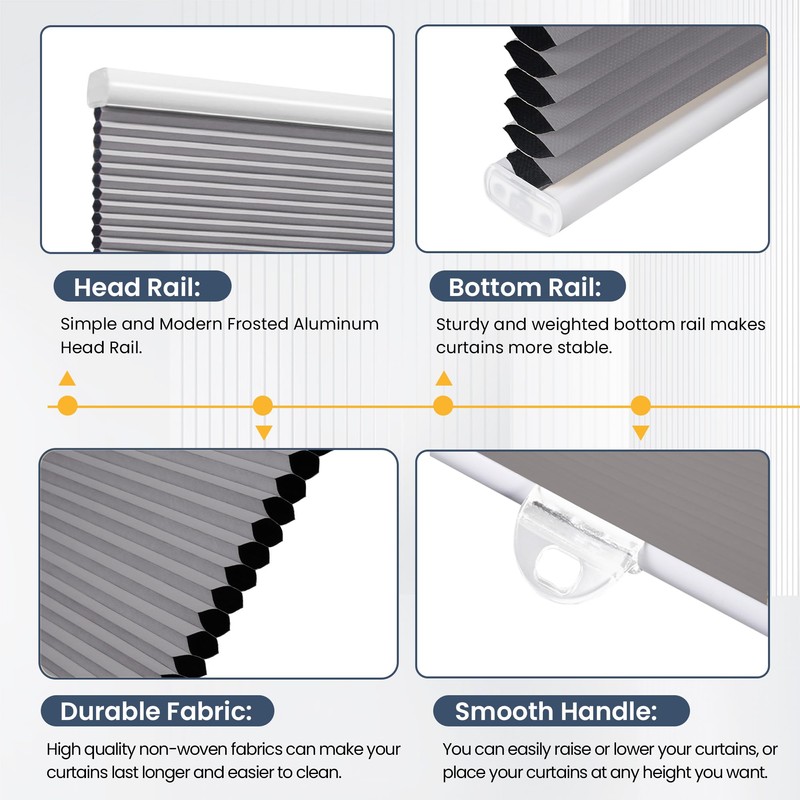 - UPGRADED CORDLESS SYSTEM: Cordless design of the cellular shade not only brings a sense of simple and elegant design to the house, but also protects the safety of children and pets.