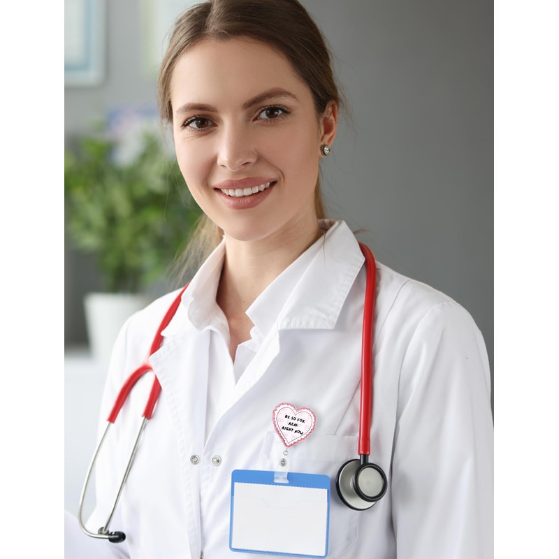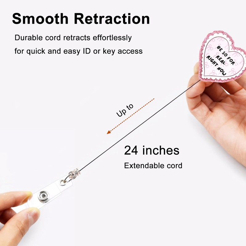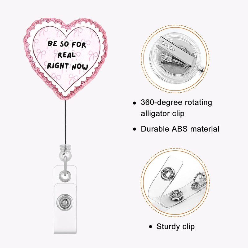 - Design Features: Heart-shaped badge reel with a pink glitter border, delicate bow pattern, and the inspirational quote, "Be so for real right now."