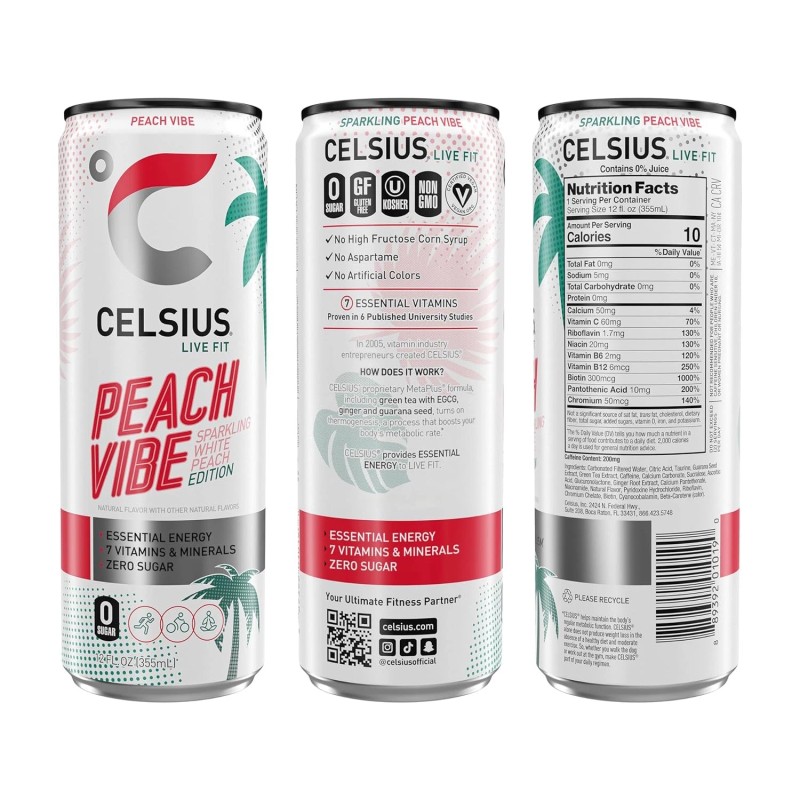 Elevate your refreshment game with Celsius Beverage Sparkling Peach Vibe, offering a bold and fruity experience with every sip. This energizing sparkling beverage combines invigorating ingredients to boost your performance while satisfying your taste buds. This pack of 12 is perfect for those seeking a vibrant and delicious pick-me-up.