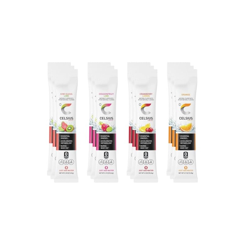 Celsius On-The-Go Energy Powder Sticks Variety Pack |Zero Sugar| |4 flavors (12 count) Orange, Dragonfruit Lime, Kiwi Guava Lime, Cranberry Lemon - Zero Sugar Electrolytes Powder