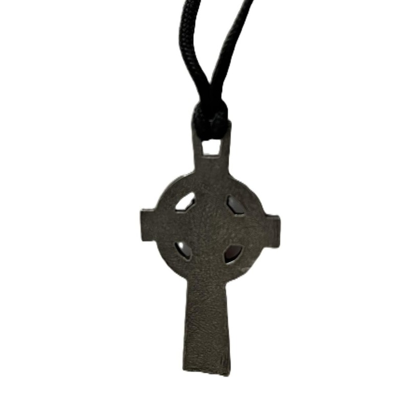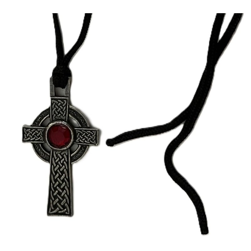 - DESIGN: Authentic Celtic cross pendant featuring intricate knotwork patterns and a striking red cabochon stone centrepiece