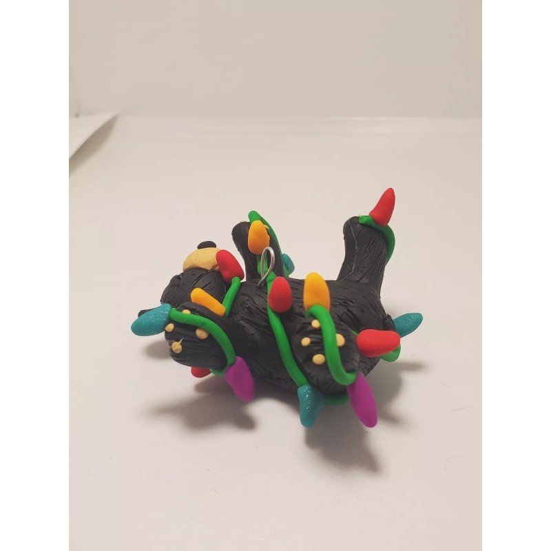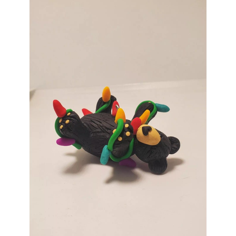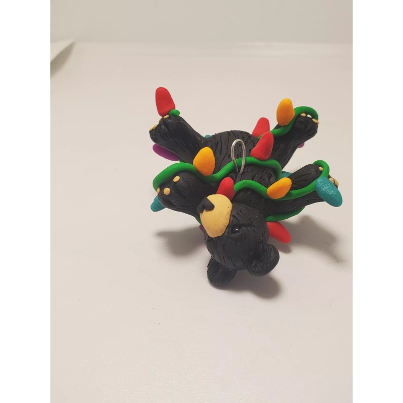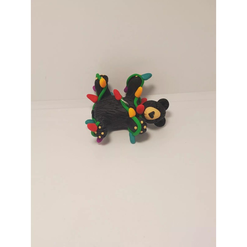 Celtic Forest Clay BLACK BEAR Christmas Ornament TANGLED IN LIGHTS Polymer Clay HAND MADE OOAK