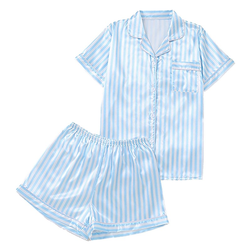 Features: Two-Piece satin comfort sleepwear pajama set featuring short sleeve button down dress shirt collar, Button-front shirt hits at hip,pocket with notch collar, which is classic. Elastic Waist Pants, More comfortable.