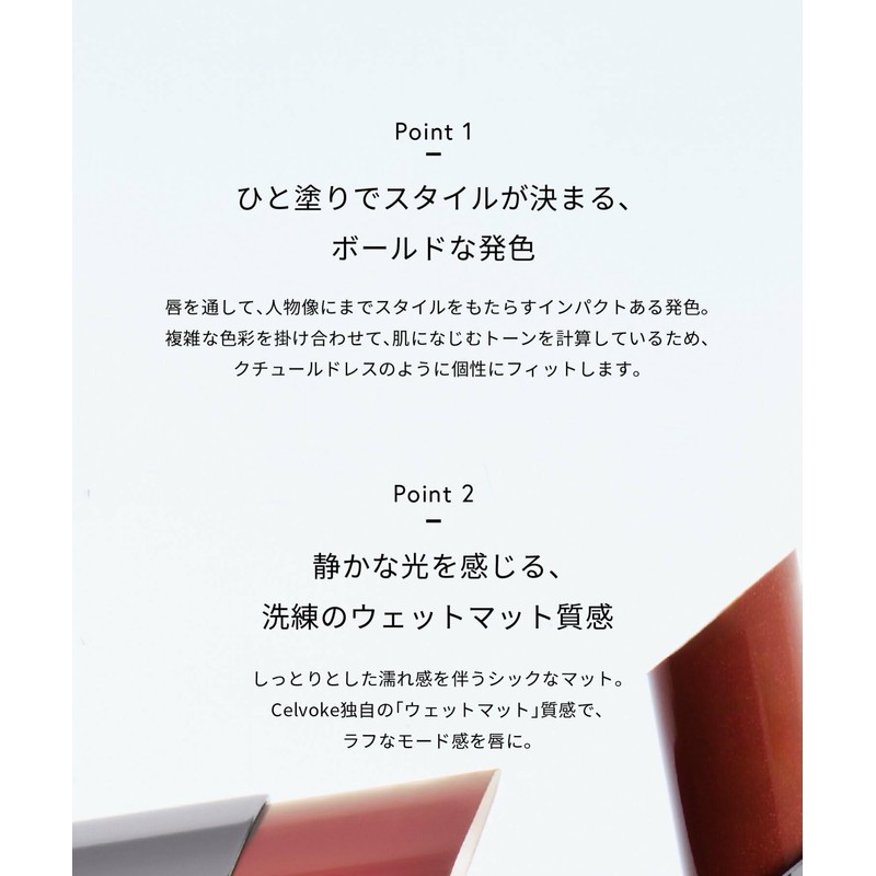 - 2. A refined wet mat texture with a quiet light feeling, chic mat with a moist wet feel. Celvoke's unique "wet mat" texture gives your lips a rough mode feel