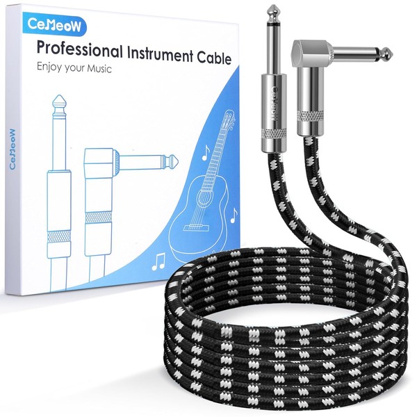 CeMeow Guitar Cable 6ft 1/4 Inch Guitar Cord Straight to Right Angle Instrument Cable with Braided Tweed and Anti-Kinking Design,Black White