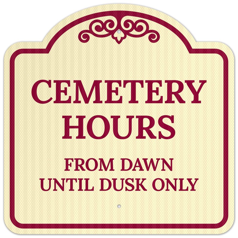 Cemetery Hours from Dawn Until Dusk Décor Sign, Burgundy Light, 24x24 Inches, Reflective .063 3MG Fade Resistant, Made in USA by Sigo Signs