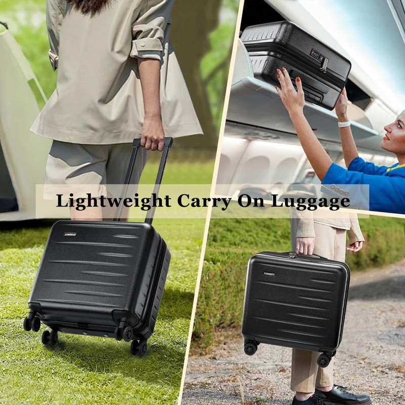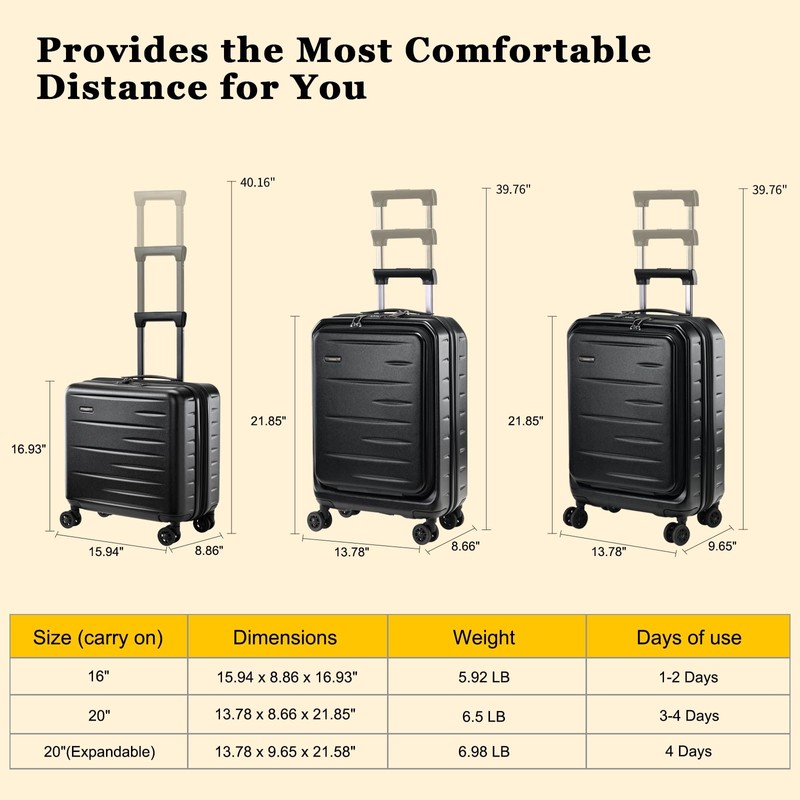 The CENSIEN 16 Inch Carry On Luggage is the perfect travel companion for short trips and weekend getaways. With dimensions of L15.95" x W8.86" x H16.93" and a weight of only 5.95 lbs, this carry-on luggage complies with airline-approved regulations, making your boarding process smooth and hassle-free. Although it cannot fit under the seat, it easily fits in the overhead bin.