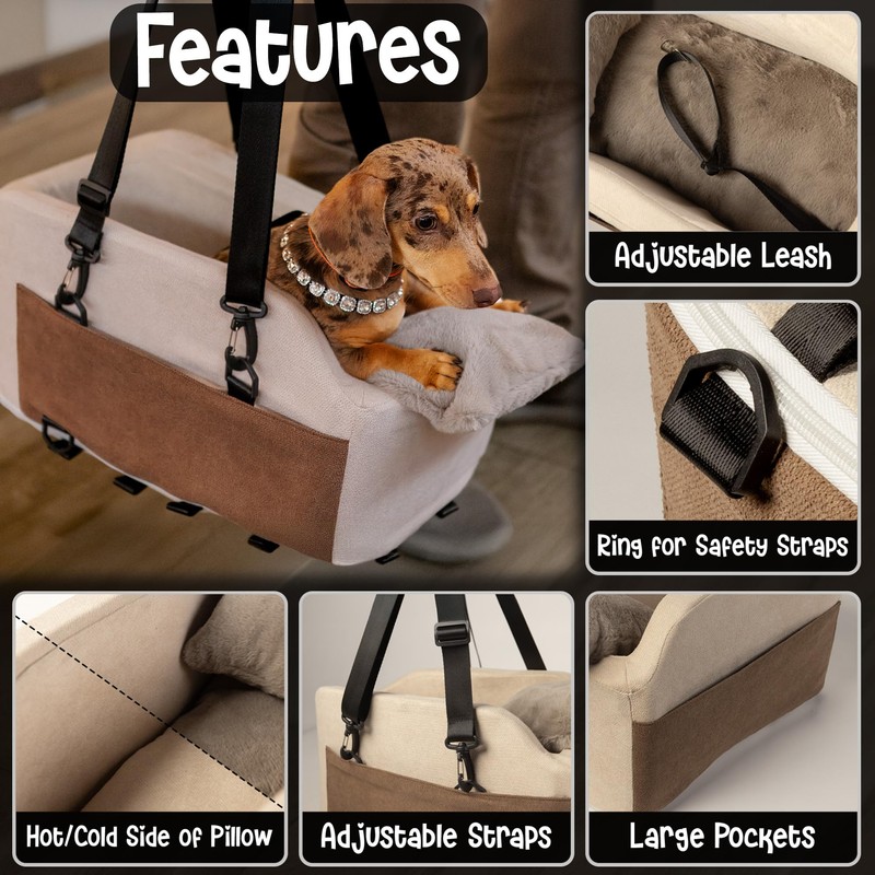 Center Console Dog Car Seat - Safety Straps & Leash - Sturdy Foam and Plush Pillows - Adjustable Mount Design - Large Storage Pockets for Accessories - Perfect for Small Pets & Cats (Khaki)