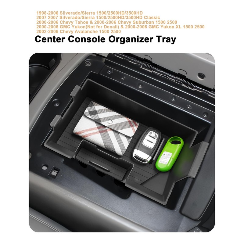 - [Tailor-Made For Your Car] The center console organizer is meticulously designed for 1998-2006 Silverado/Sierra 1500/2500HD/3500HD & 2007 2007 Silverado/Sierra 1500/2500HD/3500HD Classic & 2000-2006 Chevy Tahoe & 2000-2006 Chevy Suburban 1500 2500 & 2000-2006 GMC Yukon(Not for Denali) & 2000-2006 GMC Yukon XL 1500 2500 & 2002-2006 Chevy Avalanche 1500 2500. Please Note: Full Console w/Bucket Seats ONLY! NOT fit jump seat.