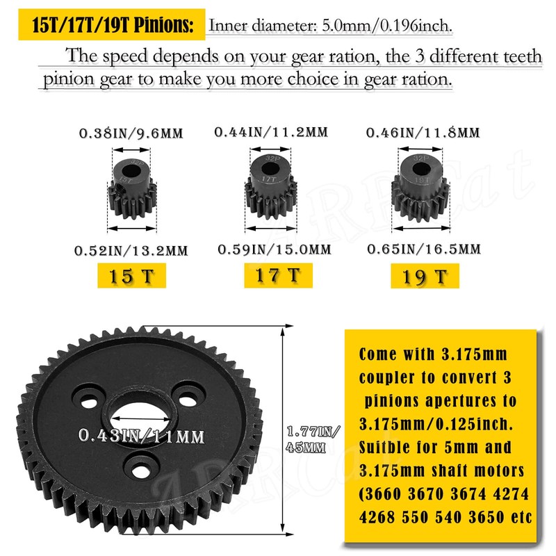 - đ„ă(54T 32-pitch) Spur gearăInner diameter: 5.0mm/0.196inch, also comes with 3.175mm coupler to convert 3 pinions apertures to 3.175mm/0.125inch. Suitble for 5mm and 3.175mm shaft motors. We provide 3 different teeth pinion gear(15T/17T/19T) to make you more choice in gear ration.
