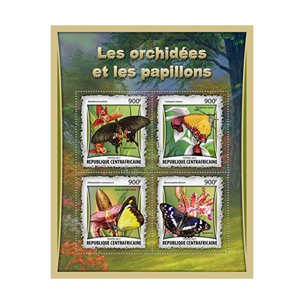 Country: Central Africa, Year of Issue: 2017, Type: 4 Stamp Sheet, Topic: Orchids, Butterflies, Coconut Pie Orchid, Mormon Swallowtail, Coelogyne Orchid, Purple Sapphire Butterfly, Chocolate Albatross Butterfly, Purple Emperor Butterfly