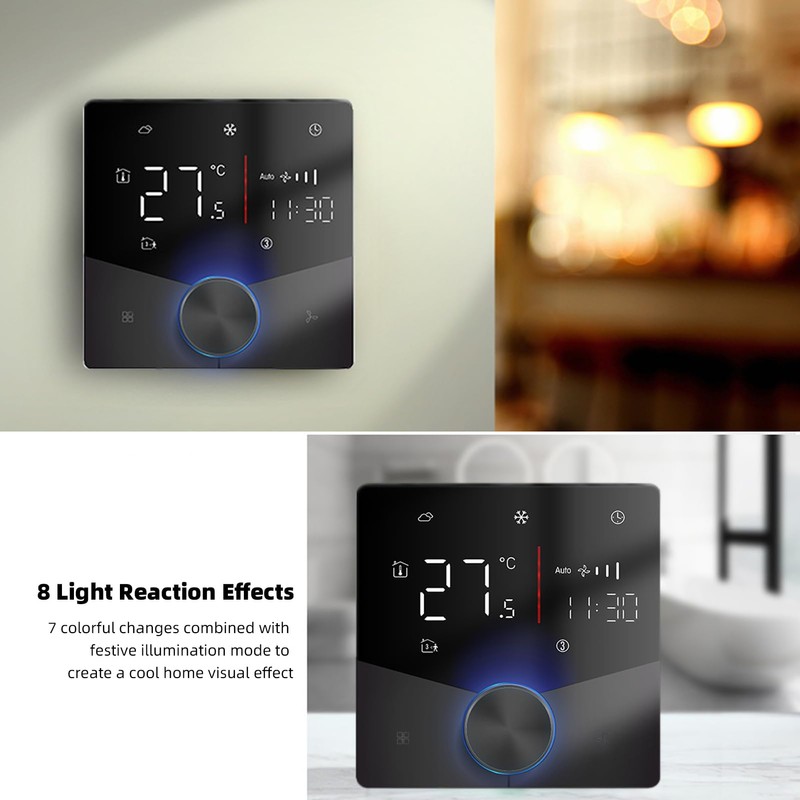 Equipped with a variety of practical functions, including child lock, Wi-Fi automatic reconnection, weather forecast, clock display, 5+1+1 programming, wind adjustment, dynamic light effects, etc. Suitable for indoor temperature control of central conditioning fan coil system or wind duct system. Users can set the operating system by themselves through a smartphone APP or manually.