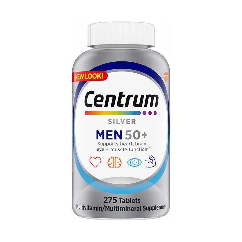 - Apoyo a la salud del CORAZÓN, VISTA, CEREBRO, MÚSCULOS + Salud General de todo el cuerpo para Hombres mayores a 50 años. Centrum Silver Multivitamins para hombre 50+ es un suplemento multivitamínico/multimineral que contiene micronutrientes para ayudar a respaldar el bienestar de todo el cuerpo. Este multivitamínico diario para hombres mayores de 50 años incluye nutrientes esenciales como vitamina D y magnesio para mantener la salud muscular, vitaminas B para promover la salud del corazón, zinc para respaldar la función cerebral normal, luteína y vitaminas A, C y E para apoyar la salud de los ojos. Los micronutrientes clave en estas vitaminas para hombres ayudan a llenar los vacíos nutricionales para promover el bienestar y la vitalidad. Este multivitamínico sénior para hombres es sin OGM y sin gluten para adaptarse a una variedad de preferencias dietéticas. Las tabletas multivitamínicas para hombres Centrum Silver tienen una capa suave que facilita su ingesta. Se recomienda tomar una tableta diariamente para proporcionar al cuerpo vitaminas y minerales clave. INGREDIENTES: