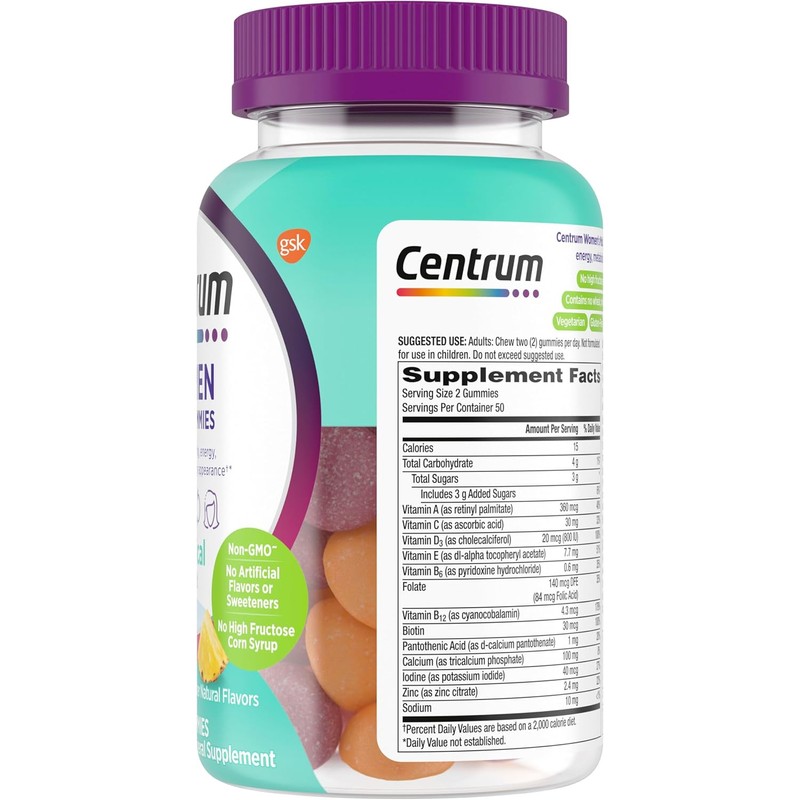 Centrum Women's Multivitamin Gummies provide essential vitamins and minerals in a delicious, tropical fruit flavor, and help support women's overall health. These gummy vitamins are contain B-Vitamins to support daily energy needs and aid in the metabolism of fats, carbohydrates and proteins (1). Centrum multigummies with vitamins C and E for immune support (1); Biotin, Vitamins A, C and E help maintain a healthy appearance (1). This multivitamin is a blend of Folate, Biotin, vitamin A, B6, B12, C, D3 and E. These adult multivitamin gummies are vegetarian, gluten free and gelatin free. These multivitamin gummies for women come in great tasting fruit flavors like Pineapple Mango. Each tasty flavor gives you high-quality nutrients your body may need with no high fructose corn syrup, synthetic dyes, or artificial flavors or sweeteners. They feature a vegetarian, pectin base. Chew two women's gummies once daily with or without food to support immunity (1), energy, metabolism and a healthy appearance (1). These gummy vitamins for women come in a bottle of 100 gummies. (1) These statements have not been evaluated by the Food and Drug Administration. This product is not intended to diagnose, treat, cure or prevent any disease.