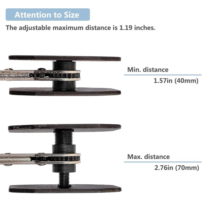 - 【Professional Tool】: This Brake Caliper Press constructed of strudy carbon steel, designed for the adjustment of automobile brake pumps. Please note, this ratcheting caliper spreader is designed to "push" the piston back, can not twist and compress at the same time, which some brakes need. Also, the distance between the two spreading plates is from 1-1/2" to 2-1/2", may not insert into some smaller caliper.