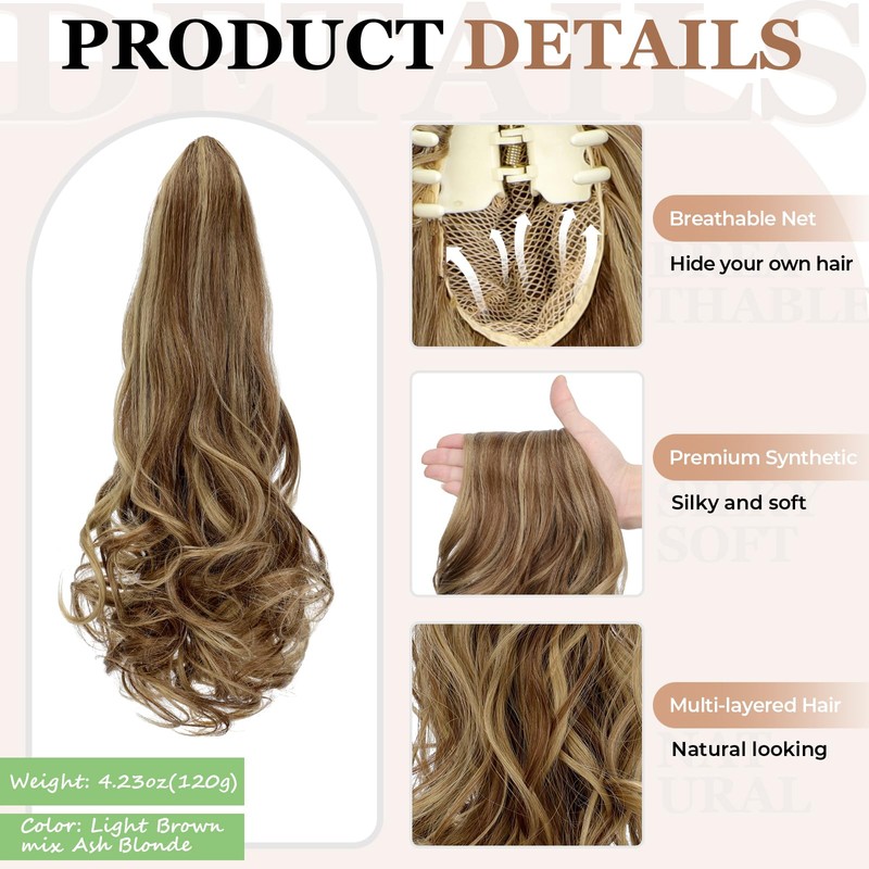 Cephermer Ponytail Extension Claw 18" Long Curly Wavy Clip in Natural Looking Synthetic Hair Extension Ponytail Hairpiece for Women Light Brown mix Ash Blonde