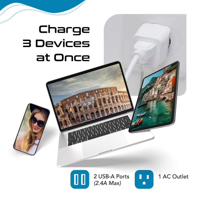 - 3 in 1 Input: Accepts the standard N American 2 or 3 prong flat pin Plug (including polarized) - No Messy Universal Outlet + Dual USB charges Upto 2. 4A ideal for iPhone, iPad, Galaxy, & other chargers