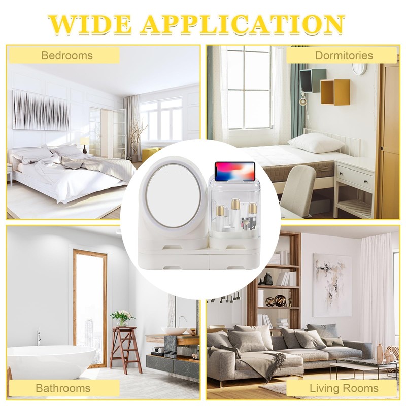 - 🏡【Built-in Fan】This makeup organizer is equipped with a small fan, and its gentle wind can promote the absorption of water and lotion, save waiting time, make your makeup more comfortable, and reduce makeup loss caused by sweating. You can control it through the buttons on the mirror surface.