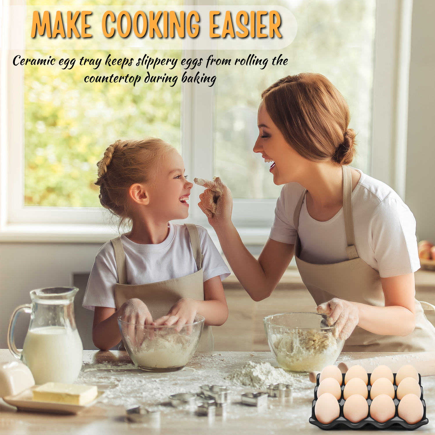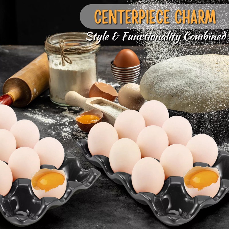 • 1 x Ceramic 12 Cups Egg Tray - Whole Dozen Porcelain Egg Holder Container Keeper Storage Organizer Decorative Serving Dish Plate for Refrigerator Fridge Countertop Display Kitchen Home 2 Pack (Black)
