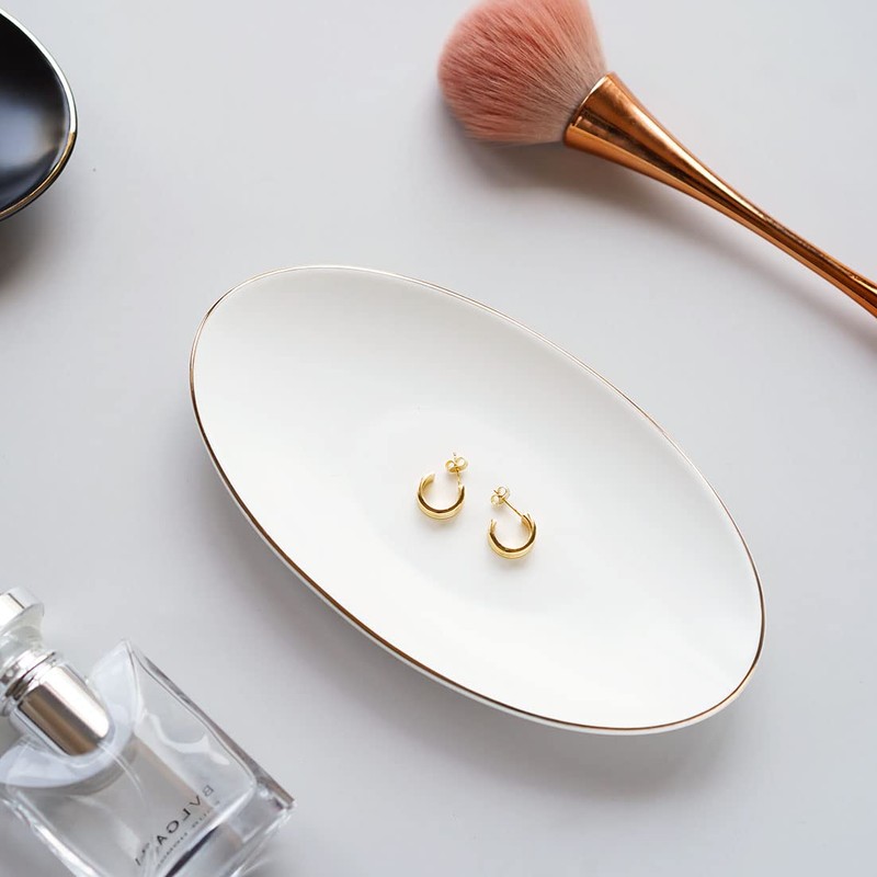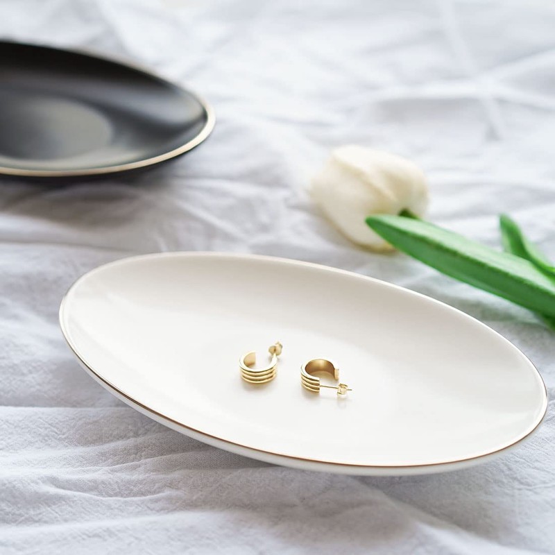 - Oval design ring dish, single color with gold trim around the edge, simple and elegant, matched well with your home decor