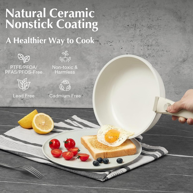 - 【Healthy Cooking Made Easy】 Our white ceramic non-stick coating is certified free of harmful chemicals like PTFE, PFAS, and PFOA, making it perfect for low-fat, gluten-free, and vegan recipes. Safeguard your family's health while enjoying effortless cooking and cleaning.
