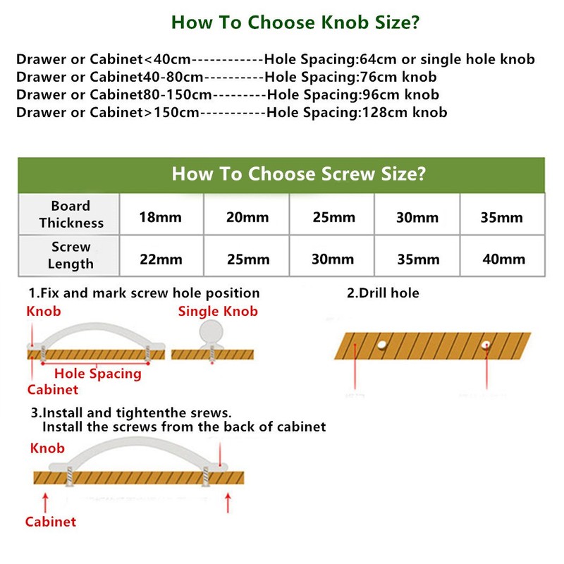 How To Choose Knob Size: We suggest you measure your furniture dimension before buy it. We have show the parameter list in picture for your reference.